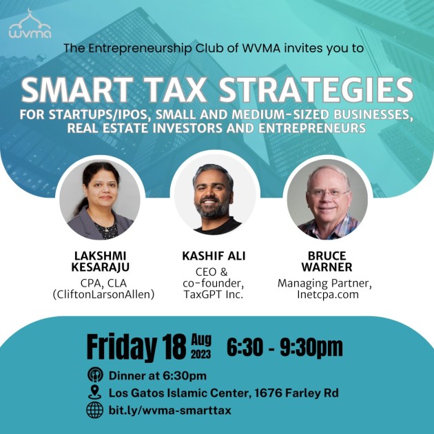 LGIC Main Hall 16769 Farley Rd, Los Gatos“Smart Tax Strategies” – an exclusive event by the Entrepreneurship Club of WVMA! Learn essential tax tips for startups, small businesses, and IPOs. Network with fellow entrepreneurs and gain valuable insights from industry experts. (The presentations of the speakers are attached) Presentations: