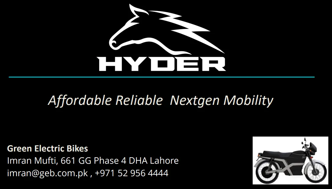 Green Electrical Bikes (GEB), a company incorporated in Pakistan by the owners of SAE Mobility LLC Texas USA, with the mission of minimizing the problem of noise and air pollution, and reducing the burden of excessive fuel prices on daily commuters for the Pakistani market. These bikes shall help with Zero CO2 emissions, reduction in financial impact due to reduction in fuel imports, and Up to 80% reduction in operational costs.